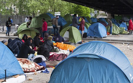 Immigrants living in tents under a subway bridge in La Chapelle, Paris