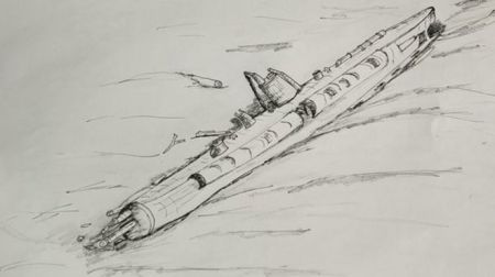 The sketch shows the conning tower in good condition and the overall state of the submarine