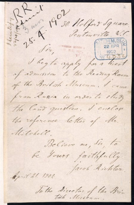During his stay in this house, Lenin sought permission from the British Museum Library to use its books. In April 1902, he used the name of ‘Jacob Richter’ to apply for a ‘reader’s ticket’. In the application, Lenin wrote that he came from Russia to study land related issues. In fact, the British Museum Library accepted his application on April 29 and sent a ticket (number A72453) to him. Lenin’s hand-written application is still there in the British Library. Lenin and his wife spent just over a year in that Holford Square house and upset the bourgeois landlady Mrs Emma Yeo with their bohemian behaviour.
