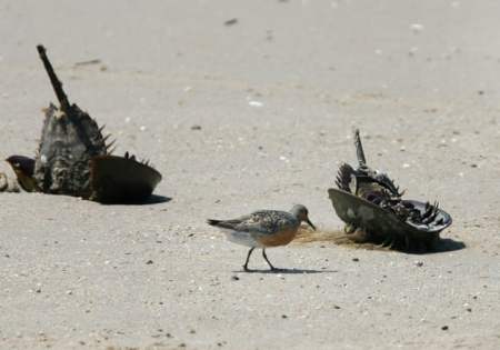 A migrating Red Knot near dead horseshoe crabs on the beach along Delaware Bay in Fortescue, New Jersey.
