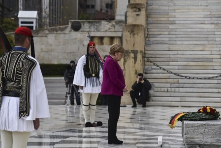 German Chancellor Angela Merkel pays tribute at the Tomb of the Unknown Soldier in Athens on January 11, 2019 (Image: AFP)