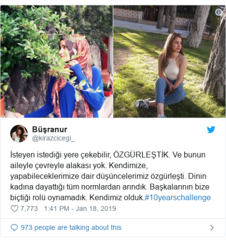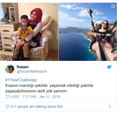 Like other participants (of the #10YearChallenge), the participating young ladies from Turkey have posted their current photographs, as well as the ones taken a decade ago, on the social media. As their decision to give up wearing hijabs is a recent one, majority of them are taking part in the #1YearChallenge. Nazan, incidentally, is one of them. She has shared a photo of herself paragliding without a hijab, along with an old headscarf-clad photo of her, with her son. She tweeted: “#1YearChallenge, there is no possible way to describe how beautiful it feels to live as you believe and as you want.”