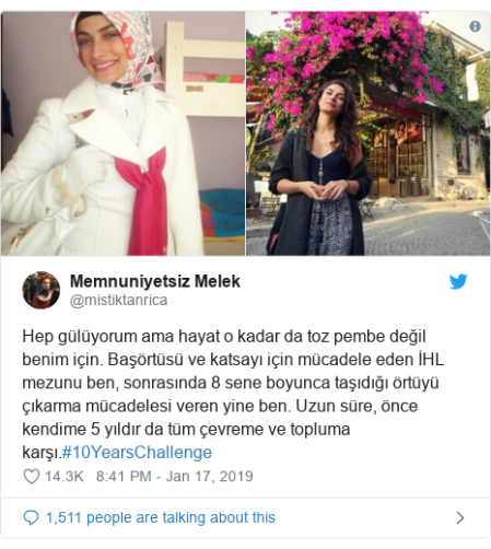For her part, Memnuniyetsiz Melek wrote on Twitter: “I do smile all the time, but life is not always bed of roses for me. As a graduate from Imam Hatip Religious High School, it was me fighting for the right of wearing a headscarf (in universities) but I also fought to take off it for eight years.” She further said: “For a long time, I had an inner struggle and for the five years, it has turned out to be struggle against my entourage and the whole society.”