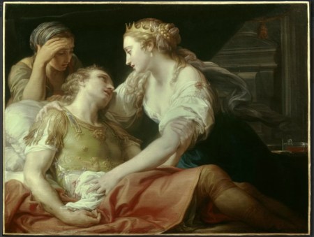 In this oil painting, Cleopatra sits beside the dying Mark Antony