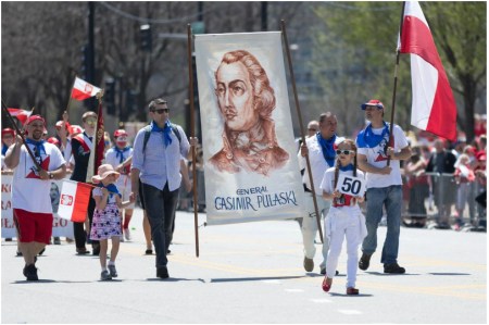 At the Polish Constitution Day Parade on May 5, 2018, Polish men hold a portrait of Gen. Casimir Pulaski and Polish flags