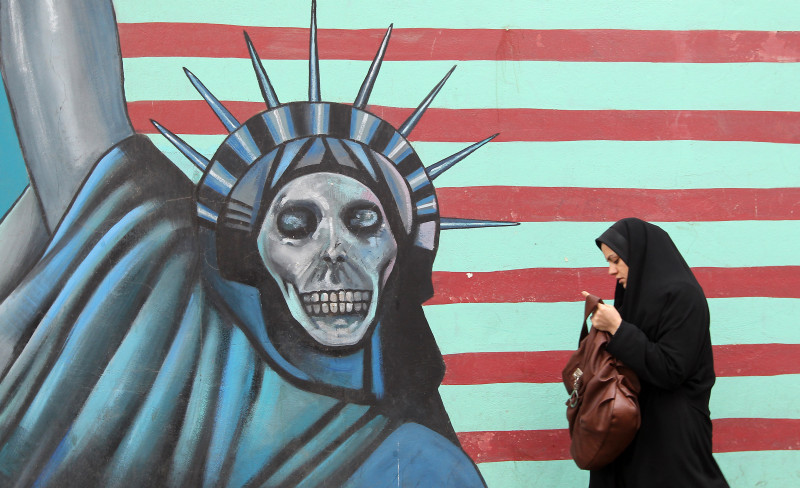 An Iranian woman walks past an anti-US m
