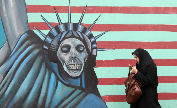 An Iranian woman walks past an anti-US mural painted on the wall of the former US embassy in Tehran on November 19, 2011. The United States said Iran was now locked in “unprecedented” isolation after UN bodies overwhelmingly condemned its nuclear programme and an alleged Tehran-planned terror plot. AFP PHOTO/ATTA KENARE (Photo credit should read ATTA KENARE/AFP/Getty Images)
