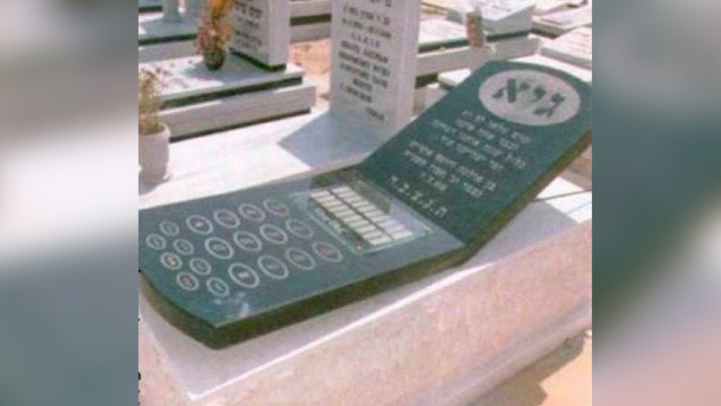 The cell-phone grave! The sculpture of an old-fashioned mobile phone is seen here! It has been installed on the grave in memory of the deceased’s love for the cellular phones.