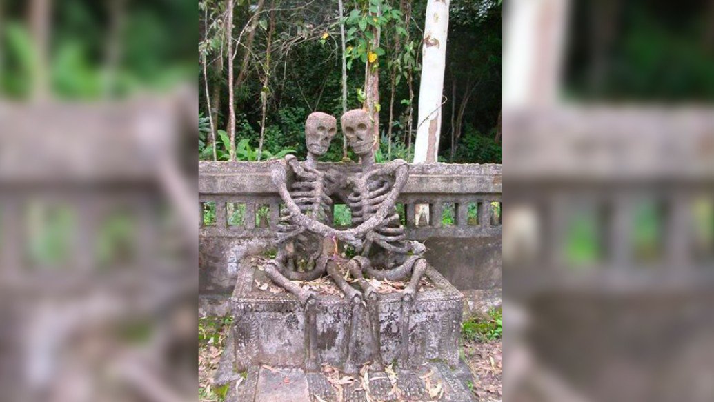 The sculpture of two skeletons, holding each other’s hands, is seen sitting on the grave. This sculpture expresses their love before the death.