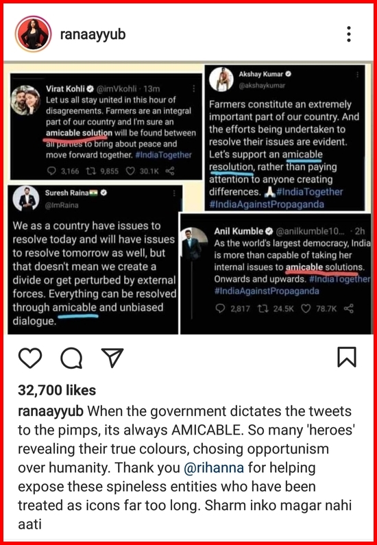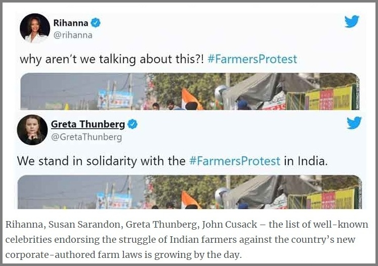 Recently, Music Star Rihanna, Environmental Activist Greta Thunberg and several American Politicians have taken to the Social Media to back the ongoing Farmers’ Protests in India, and to slam the Government of India’s Agricultural Policy. As expected, their comments have immediately created a storm by means of a variety of reactions in different parts of the South Asian country. This time, mainly the two camps provide additional materials to the shemozzle. Apart from the Government of India, the noted Indian sports and film personalities have launched an attack on Rihanna, Thunberg and others for backing the Farmers’ Protests! The manner in which the eminent Indian sports and film personalities are attacking foreign critics in defence of National Honour is indeed arousing shivers…