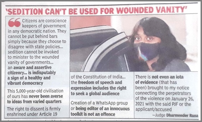 Justice Dharmendra Rana, the Additional Sessions Judge of Delhi’s Patiala House Court, delivered an important verdict on February 23, 2021. The verdict can be considered proverbial, obviously forgotten by the modern States in different parts of the Globe. While granting bail to 22-year-old Climate Activist Disha Annappa Ravi, Justice Rana reminded the people of India that the Constitution of this South Asian Country gives its Citizens the Right to Protest (as a part of Freedom of Speech). He categorically said: “Citizens can’t be put behind bars simply because they choose to disagree with State Policies. The offence of Sedition cannot be invoked to minister to the wounded vanity of the Governments.”