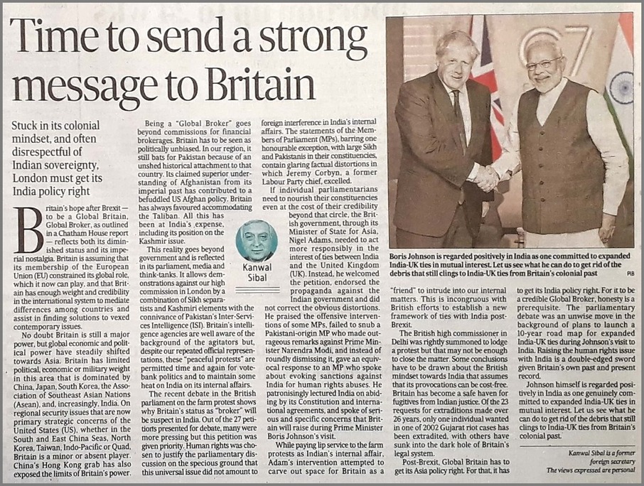 Kanwal Sibal, the former Foreign Secretary of India, believes that it is the time for India to send a strong message to Britain. In an article published in Hindustan Times daily on March 17, he wrote that London, stuck in its colonial mindset and often disrespectful of Indian sovereignty, must get its India Policy right.