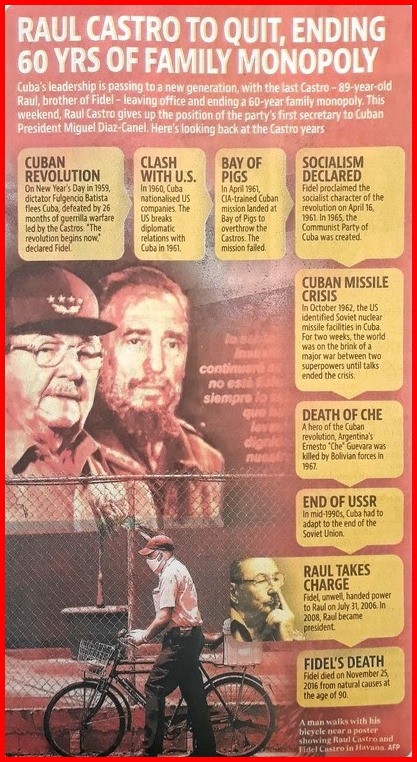 Cuba has been led by Fidel Castro (August 13, 1926 – November 25, 2016), the Father of the Cuban Revolution (July 26, 1953 – January 1, 1959), and later by his brother Raúl Castro for the last 60 years. On April 17, 2021, Raúl handed over the post of First Secretary of the Communist Party to Cuban President Miguel Díaz-Canel during the Communist Party Congress in Havana. With this, control of the Party went to a member of the younger generation, thus, ending an Era in Cuban Politics!