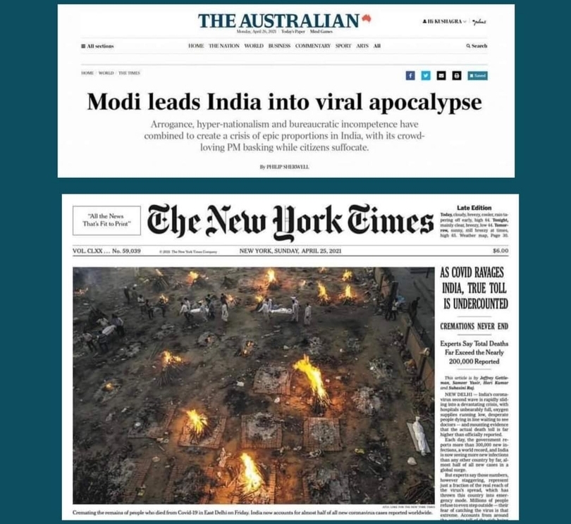 The failure of the Government of India has also made headlines in the Global Media. Economist, The Guardian and Time have directly blamed the Indian PM for this situation, with The Guardian stating: “The system has collapsed: India’s descent into COVID hell.” The British daily added: “Many falsely believed that the country had defeated COVID-19. Now, hospitals are running out of oxygen and bodies are stacking up in morgues.”