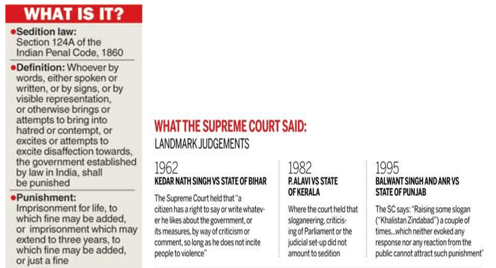 The SC Bench, comprising Chief Justice N V Ramana, Justice A S Bopanna and Justice Hrishikesh Roy, also raised concern over the (mis)use of Sedition Law, stressing that there was no accountability. “There is no accountability. Once you see Section 124-A in FIR, everyone gets scared.” It may be noted that the First Information Report (FIR) is a document prepared by the Police Departments in South Asian and Southeast Asian countries, including Myanmar, India, Bangladesh and Pakistan, when they receive information about the commission of a cognisable offence. The Bench also wondered at the continuance of the Colonial-era penal law on Sedition in statute book for last 75 years, stating: “We do not know why the Government is not taking a decision. Your Government has been getting rid of stale laws.“