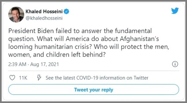 On Facebook, the author of The Kite Runner and A Thousand Splendid Suns wrote: “There are many lasting horrific images from the last time the Taliban ruled Afghanistan: the public beatings, the cutting off of hands, the executions inside stadiums, the barbaric and senseless destruction of historical artefacts. But for me, the lasting mental picture of the Taliban circa 1990’s is that of the stick holding Talib beating a burqa-clad woman.” He also wrote: “The Taliban systematically terrorised women. They took away their freedom of movement, their freedom to work, their right to education, their right to wear jewellery, to grow their nails or paint them, to laugh in public, to even show their faces. Is that what is in store for my cousin? For her daughter? And the countless brave Afghan women who for 20 years laboured to achieve some measure of autonomy, dignity, and selfhood?“