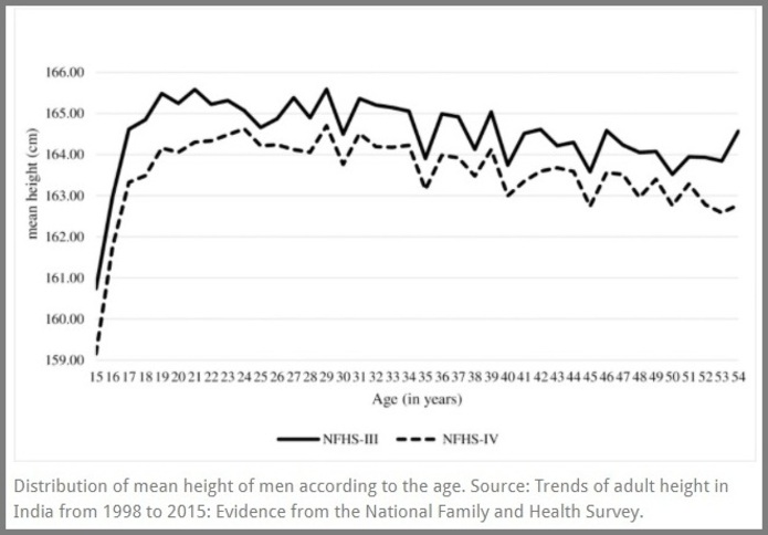 The main objective of the study, titled ‘Trends of adult height in India from 1998 to 2015: Evidence from the National Family and Health Survey‘, by Krishna Kumar Choudhary, Sayan Das and Prachinkumar Ghodajkar of the Centre of Social Medicine and Community Health (JNU) was to find out the difference in the average height of Indians on the basis of the National Family Health Survey (NFHS) data conducted by the Indian Ministry of Health in every 7-10 years. After analysing the NFHS data, Choudhary, Das and Ghodajkar have come up with sensational information. They have also divided that information again into criteria based on gender, socio-economic status, wealth, age and the like. “We believe, in the context of an overall increase in average heights worldwide, the decline in average height of adults in India is alarming and demands an urgent enquiry,” wrote the authors of the study paper.