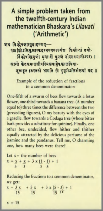 Here is an excerpt from Līlāvatī’s work (appears as an additional problem attached to stanza 54, Chapter 3. Translated by T N Colebrook): “Whilst making love a necklace broke./ A row of pearls mislaid./ One sixth fell to the floor./ One fifth upon the bed./ The young woman saved one third of them./ One tenth were caught by her lover./ If six pearls remained upon the string/ How many pearls were there altogether?” Bhaskaracharya’s conclusion to Līlāvatī states: “Joy and happiness is indeed ever increasing in this world for those who have Līlāvatī clasped to their throats, decorated as the members are with neat reduction of fractions, multiplication and involution, pure and perfect as are the solutions, and tasteful as is the speech which is exemplified.”