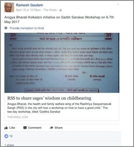 For business purposes, various companies have opened Gender Selection Clinics across the US and South Korea. The future parents have been told that they would be able to determine the gender of their babies in a scientific way, apart from measuring their intelligence and determining skin colours, even before their birth. Since 2017, Arogya Bharati, the Health Wing of the Rashtriya Swayamsevak Sangh (RSS, an Indian right-wing, Hindu nationalist, paramilitary volunteer organisation), has been vigorously promoting a project, called Uttam Santati or Genius Babies, in India. In 2017, the Indian Express daily reported that the procedure for such a perfect child according to the Garbh Sanskar programme was three months of shuddhikaran (purification) for parents, intercourse at a time decided by planetary configurations, complete abstinence after the baby was conceived, and procedural and dietary regulations. According to the daily, National Convener of Arogya Bharati Dr Hitesh Jani claimed that the programme could produce tall and fair babies. Dr Jani also claimed that Garbh Sanskar enabled “genetic engineering in vivo or inside the womb”, while modern day Genetic Engineering was done in vitro or in a petri dish. In other words, Eugenics has returned in the guise of Modern Science, mixed with Religion and Politics.