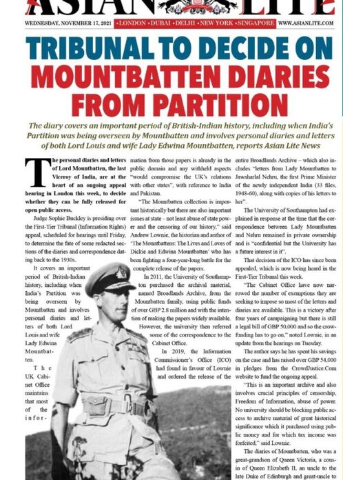 Meanwhile, the Tribunal in London would soon determine whether all of the private diaries and letters of Lord and Lady Mountbatten should be released to the public, in spite of concerns by the British Cabinet Office.
