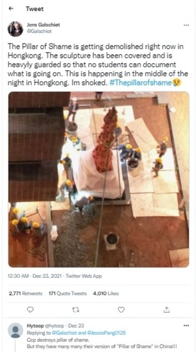Experts have expressed serious concern over the removal of the Pillar of Shame from the University campus, saying that it is the final blow to Hong Kong’s independence. They believe that the removal is testament to the ruling Communist Party’s efforts to erase the bloody events of that day from the public consciousness. Meanwhile, members of the Democratic Artists Association have joined hands to create a 3D model of the Pillar, as they want the sculpture to secure its place in the human minds.