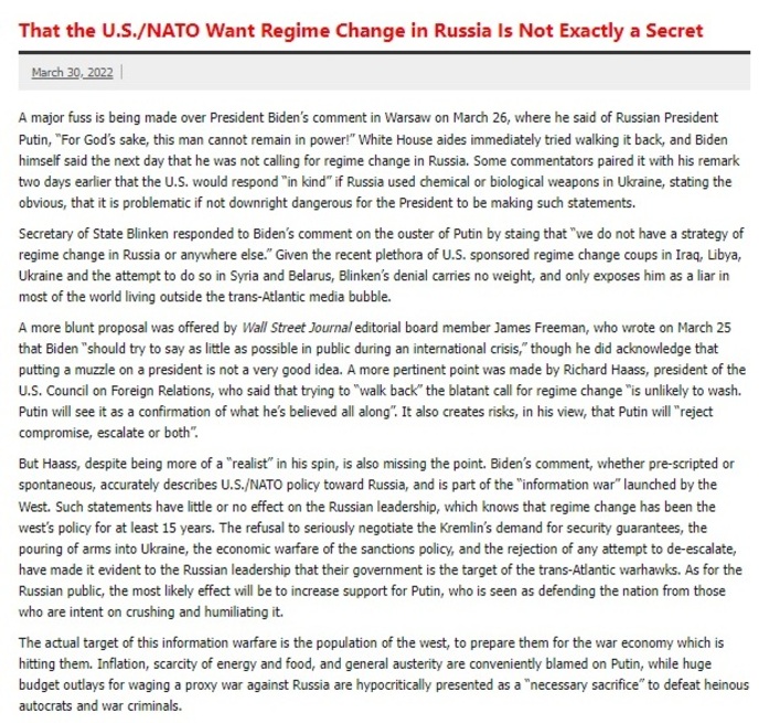 The portal added: “US Secretary of State Antony Blinken responded to President Biden’s comment on the ouster of Putin by stating that ‘we do not have a strategy of regime change in Russia or anywhere else’. Given the recent plethora of US sponsored regime change coups in Iraq, Libya, Ukraine, and the attempt to do so in Syria and Belarus, Blinken’s denial carries no weight, and only exposes him as a liar in most of the world living outside the trans-Atlantic media bubble.”