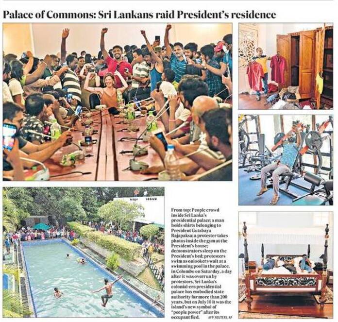 Thousands of protesters, who stormed the official residence of Sri Lankan President Gotabaya Rajapaksa in Colombo on July 9 (2022) demanding the resignation of his Government amid the ongoing economic crisis, reportedly came across a flight of stairs, as soon as they opened the door of a cupboard. The stairs took them to an iron door. According to protesters, there was probably a tunnel on the other side of that door. They believe that the President escaped from his palace through that tunnel. The Sri Lankan media have released various videos, showing protesters vandalising the President’s Palace. While some protesters took their bath in the swimming pool, others enjoyed food in the kitchen of the President’s official residence. Even some did catch a wink or two, on the President’s couch.