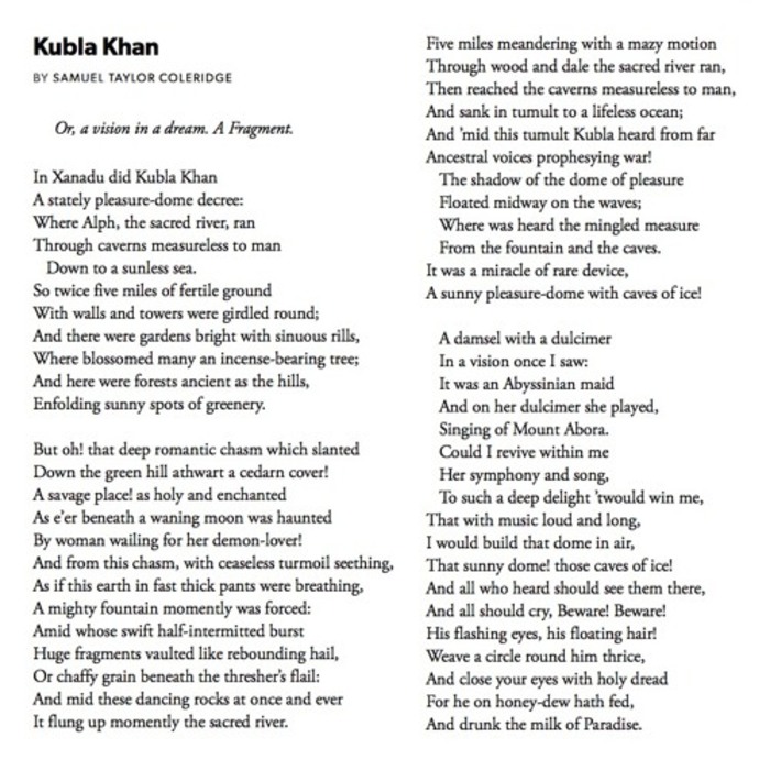 The unfinished verse is Kubla Khan (Or, a Vision in a Dream. A Fragment), while the dreamer was English poet, literary critic, philosopher and theologian Samuel Taylor Coleridge (October 21, 1772 – July 25, 1834). Together with his friend William Wordsworth (April 7, 1770 – April 23, 1850), Coleridge founded the Romantic Movement in England. He penned this famous verse 225 years ago in 1797.