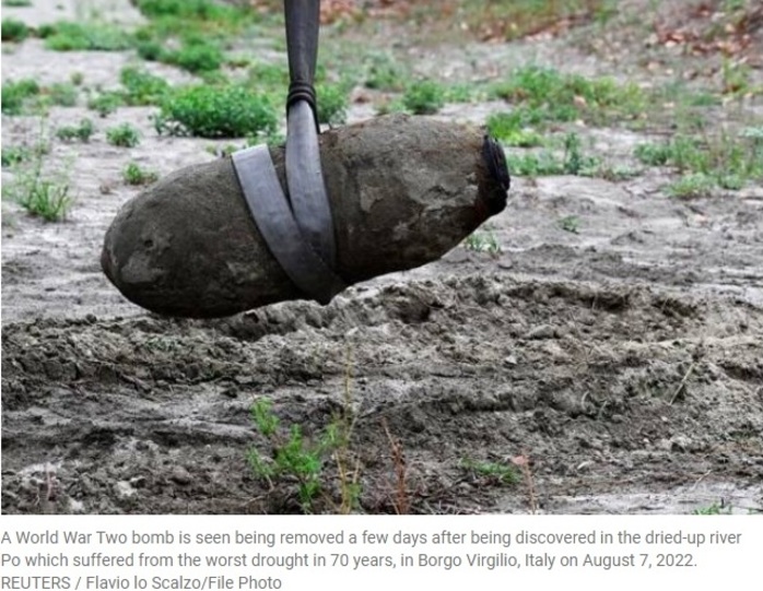 Italy, too, declared a State of Emergency in areas around the River Po in late July after archaeologists discovered a previously submerged 450kg World War Two bomb in the low-running waters of the longest river of the country. The Government of Italy also evacuated around 3,000 people living near the northern village of Borgo Virgilio (near Mantua). Later in August, military experts defused the bomb and also carried out a controlled explosion of a device manufactured in the US.