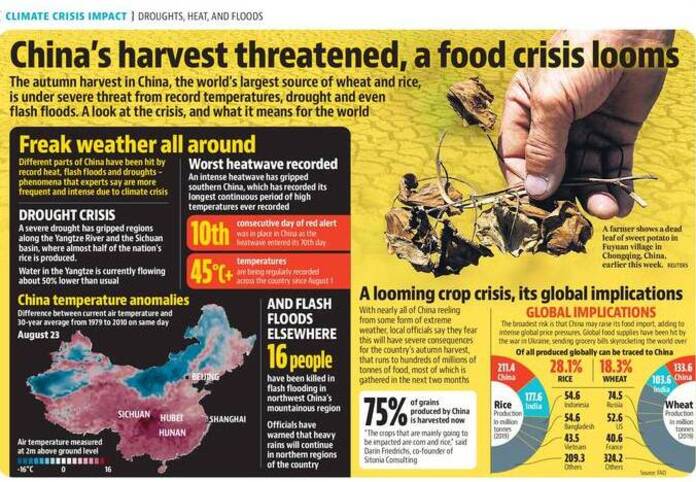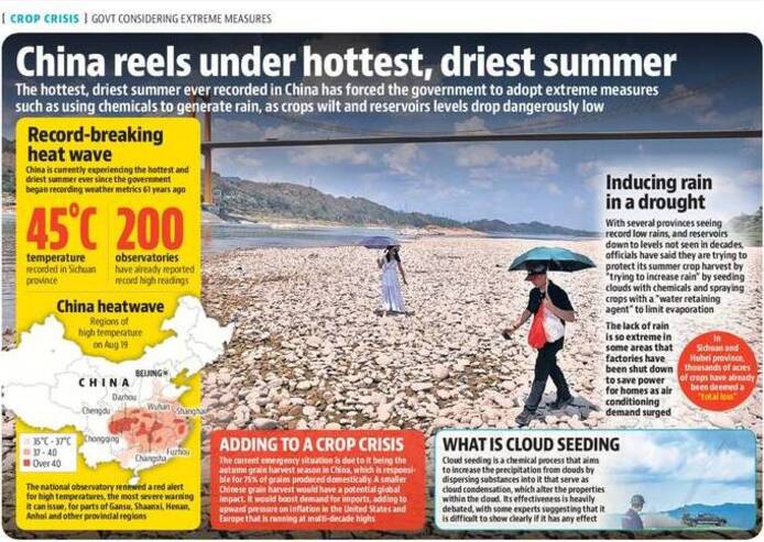 In Asia, China is facing its longest and most severe drought ever recorded. Reports suggest that the drought is affecting hydropower generation, with rivers drying up. The intensity, impact, scale and duration of the ongoing heatwave have prompted the concerned authorities in Beijing to issue a nationwide drought alert on August 19 (2022). Meteorologists have predicted that the long-running heatwave in the south-western region of the country would continue till September.