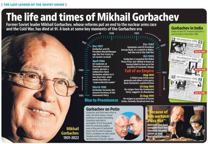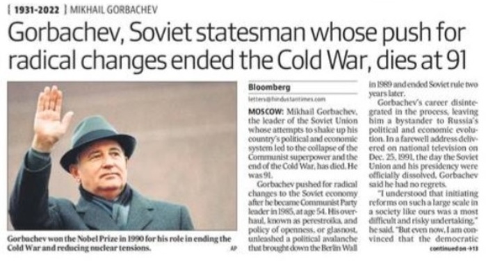 For the world, it seemed that Socialism withered away in the late 1980s. It was not a great time for the Leftists across the globe. Mikhail Sergeyevich Gorbachev (March 2, 1931 – August 30, 2022) was the one who is said to have triggered the end of the 74-year-long Socialist Era in the erstwhile Soviet Union. The demise of the last Soviet leader on August 30, 2022, at the age of 91, has reminded the global community of the fact that a person is always remembered, if s/he plays a huge historical role.