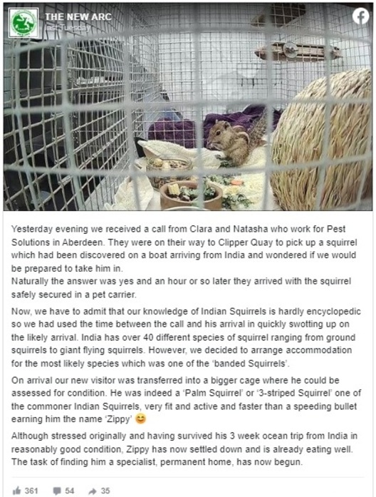 No one noticed him, as he went abroad onboard a ship. A squirrel travelled thousands of kilometers by ship from India, and reached Scotland. Staff at a wildlife hospital in Aberdeenshire recently rescued the little animal.