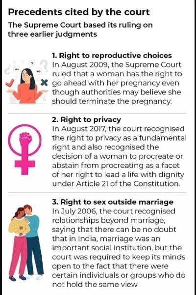 1) that even unmarried women are eligible to seek termination of pregnancy of 20-24 weeks, from a consensual relationship. 2) to extend the benefit of MTP Rule 3B(b) to all women under 18 years of age. 3) meaning of rape to include marital rape. “A narrow interpretation of Rule 3B, limited only to married women, would render the provision discriminatory towards unmarried women and violative of Article 14 (Equality before Law) of the Constitution,” stated the SC Bench. The Apex Court explained that when other sections of women enjoyed the Right to Abortion, there was no basis for depriving unmarried women of this Right.
