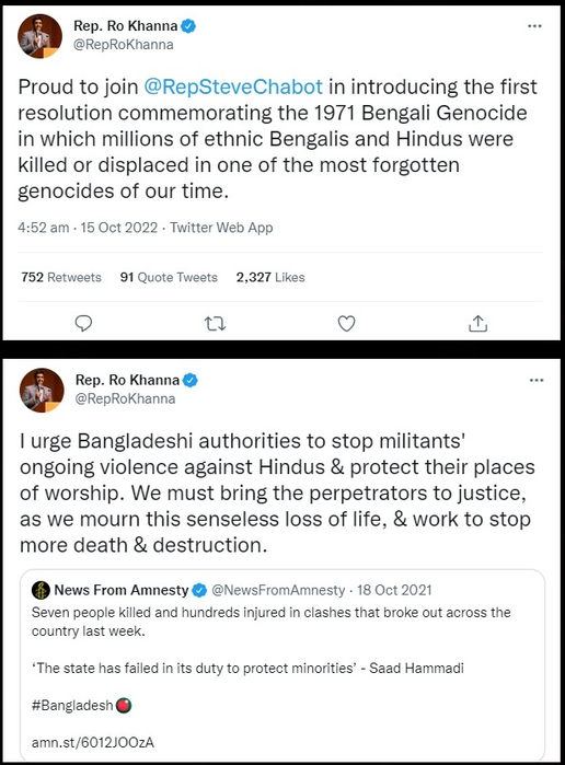 On his Twitter account, California’s Democrat Congressman Khanna wrote that he was “proud to join @RepSteveChabot in introducing the first resolution, commemorating the 1971 Bengali Genocide in which millions of ethnic Bengalis and Hindus were killed or displaced in one of the most forgotten genocides of our time“.