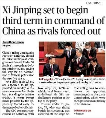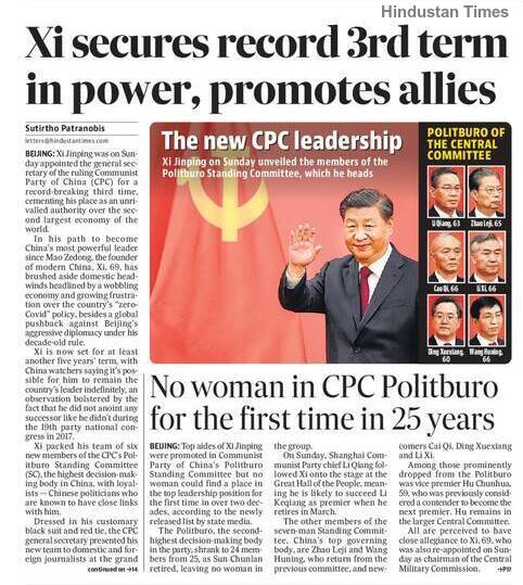 After the Party Congress, Xi is now all but certain to sail through to a third term as the President, due to be formally announced during the Government’s Annual Legislative Sessions in March 2023. It may be noted that Xi had abolished the Presidential Two-term limit in 2018, paving the way for him to govern China indefinitely.