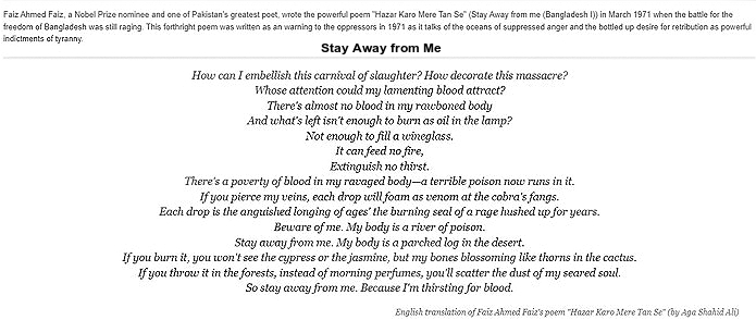 Tahira has recalled that Faiz Ahmad Faiz (February 13, 1911 – November 20, 1984) was one of those poets (in Urdu and Punjabi languages) who penned the verse ‘Hazar karo mere tan se‘ (‘Stay Away from Me‘), depicting the horrific atrocities in Bangladesh. The dream of Muhammad Ali Jinnah (December 25, 1876 – September 11, 1948), the founder of Pakistan, was shattered, as the South Asian nation became a thoroughly Undemocratic State, with many imprisoned for treason within a few years of Independence (1947). Faiz, who spent his childhood in Dhaka before arriving in Pakistan after the Partition of the Indian Sub-continent, was arrested for writing the verse.
