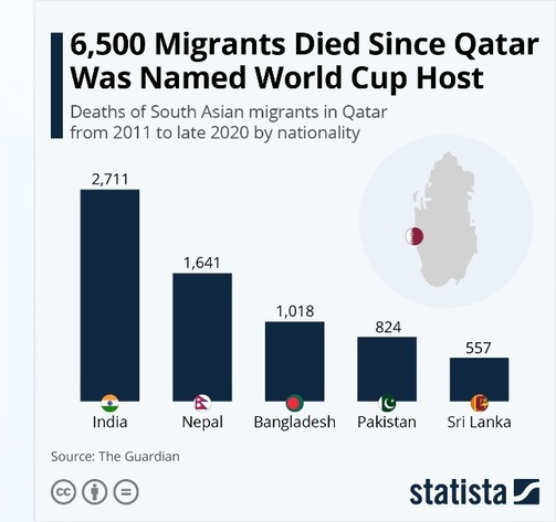 The place, with the nickname Valley of Death, is currently hosting the greatest show on Earth… the FIFA World Cup. The Global Media have commented like this on the ongoing FIFA World Cup Qatar 2022, as quite a number of migrant workers died in the West Asian nation ahead of the largest single sporting event. Reports suggest that at least 6,500 migrant workers lost their lives in Qatar during various construction works, including seven stadia, in 2010-20… among them, 2,711 were Indians, 1,641 were citizens of Nepal, 1,018 were from Bangladesh, and 557 were from Sri Lanka. According to the information received from the Embassy of Pakistan in Doha, nearly 824 Pakistani workers died during that period of time. There is no information about workers from countries, like the Philippines and Kenya. Amnesty International (AI) has claimed that nearly 15,021 migrant workers died on duty in the small country, situated on the north-eastern coast of the Arabian Peninsula.