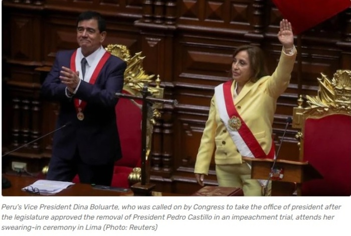 As the situation went out of control, the Congress immediately moved ahead with the previously planned impeachment trial, with 101 votes in favour of removing Castillo, six against and 10 abstentions. The result was announced with loud cheers, as the Legislature called Vice President Dina Boluarte to take office. Boluarte, who was sworn in as President through 2026, reportedly called for a political truce to overcome the ongoing crisis, saying that a new Cabinet, inclusive of all political stripes, would be formed soon.