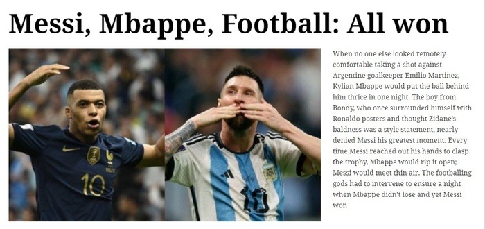 It would have been the perfect outcome had either Argentina or France won the World Cup. Argentina made a strong comeback after losing their opening match against Saudi Arabia. Their fans strongly supported the team throughout the tournament. France Coach Didier Claude Deschamps (b. October 15, 1968) is a fearless person. Even before the World Cup, he had come to know that Karim Mostafa Benzema (b. December 19, 1987), Paul Labile Pogba (b. March 15, 1993) and N’Golo Kanté (b. March 29, 1991) would miss the mega event. Still, he managed to take France to the final.