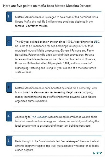 BBC reported that Denaro was undergoing treatment for cancer by identifying himself as Andrea Bonafede, the nephew of deceased Mafia boss Leonardo Bonafede. Through phone-mapping, the Police came to know that the mobile of real Bonafede was not in Palermo in 2020-21, when a person, using that name, had a surgery in the capital of Sicily.