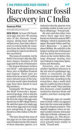 Paleontologists recently discovered at least 250 fossilised eggs and more than 90 nesting sites of Titanosaurus (a dubious genus of sauropod dinosaurs), dating back about 67 million years, in the central Indian Province of Madhya Pradesh. Researchers from the Delhi University and the Kolkata-based Indian Institute of Science Education and Research, involved in the excavation, have confirmed that they found nests and 256 eggs of the herbivorous titanosaurs in the Narmada Valley.