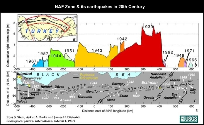 Usually, Tectonic plates, while shifting their positions, cause earthquakes. As Turkey is located at the intersection of four tectonic plates, it is in the list of most earthquake-prone countries. Most of this country lies on the Anatolian Tectonic plate, which is again located between the Eurasian, African and Arabian Tectonic plates. The Arabian plate continuously collides with the Anatolian plate that rotates anti-clockwise. According to geologists, repeated collisions between the Arabian plate and the Anatolian plate prompt the latter to collide with the Eurasian plate. Continuous collisions between these plates often trigger earthquakes in Turkey. Interestingly, a fault line, called North Anatolian Fault Line (NAF), has been formed where the Anatolian plate meets the Eurasian plate, in particular. The NAF is an active right-lateral strike-slip fault in northern Anatolia, and a transform boundary between the Eurasian plate and the Anatolian plate. The fault extends westward from a junction with the East Anatolian Fault at the Karliova Triple Junction in eastern Turkey, across northern Turkey and into the Aegean Sea for a length of 1,500km.