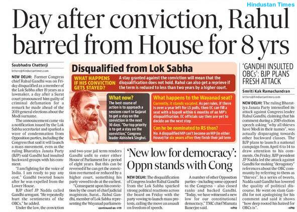 Rahul Gandhi, the leader of Indian National Congress (INC, the main Opposition Party) was convicted in a criminal defamation case in a Surat court on March 23, 2023. He was also disqualified as a Member of Parliament, and would not be eligible to contest elections for eight years, unless the verdict by the local court in Surat gets changed by a higher court. Announcing his disqualification, the Lok Sabha (the Lower House of the Indian Parliament) Secretariat stated in a notification that it was effective from March 23, the date of his conviction. “Consequent upon his conviction by the Court of Chief Judicial Magistrate, Surat… Rahul Gandhi, Member of Lok Sabha, representing the Wayanad Parliamentary Constituency of Kerala, stands disqualified from the membership of Lok Sabha from the date of his conviction i.e. March 23, 2023,” the Secretariat stressed on March 24.