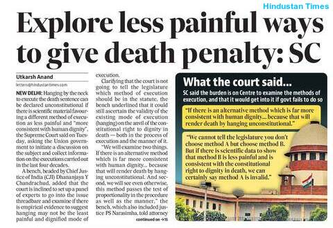 During the hearing, the Bench observed: “We cannot tell the Legislature that you adopt this method. But you (PIL petitioner) can certainly argue that something may be more humane… In lethal injections too, the person really struggles. On what basis does the Law Commission say that lethal injection is not a lingering death. There have been great divergences on what chemicals are to be used too. What research is there?” It also said: “We can have perspective on alternate methods (for executing the death row convicts). Or can we see whether this method (of hanging the convicts) satisfies the test of proportionality for it to be upheld? We must have some underlying data before we relook at it. You (Attorney General) can come back to us by next week and we can formulate a small order and constitute the committee. We can hear you on its remit (scope and ambit of the committee).” Meanwhile, the Bench agreed that there should be a more humane and dignified way of executing the death penalty or a noble mode of capital punishment.