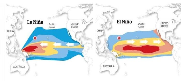 It may be noted that La Niña causes the jet stream to move northward and to weaken over the eastern Pacific. During La Niña winters, the South witnesses warmer and drier conditions than usual. The North and Canada tend to be wetter and colder. During La Niña, waters off the Pacific coast are colder and contain more nutrients than usual. Meanwhile, the term El Niño refers to a warming of the ocean surface, or above-average sea surface temperatures, in the central and eastern tropical Pacific Ocean. El Niño takes place in countries along the eastern coast of Latin American Pacific Ocean, including Chile and Peru, in every two-seven years. As a result, the temperature of the ocean water level (or the sea surface) increases by two-four degrees Celsius. The atmosphere becomes warm in coastal areas, too, prompting the current of warm water to flow from the western edge of the Pacific Ocean to the eastern side of it. Then, the warm water of the east coast increases the temperature of several areas adjacent to the ocean. When it happens, cold water cannot rise from the bottom of the sea. Hence, the surface water does not get a chance to cool down.