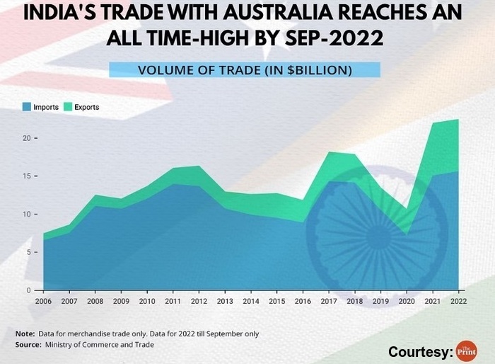 China overtook Japan in 2010 to become Australia’s largest bilateral trading partner. In the next decade or two, India has the potential to surpass China. However, India’s trade deficit in 2022 reached a record high of USD 192.41 billion. In 2019-20, India ranked 8th among Australia’s top 10 trading partners, while Australia was the 6th largest export market for India. Unfortunately, in Australia’s top 10 investment destinations, and import and investment sources, India is invisible.