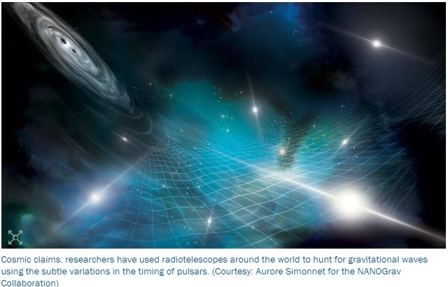 In search of evidence, they launched an expedition, called the International Pulsar Timing Array (IPTA). IPTA is a consortium of consortia, comprising of the European Pulsar Timing Array (EPTA), the North American Nanohertz Observatory for Gravitational Waves (NANOGrav), the Indian Pulsar Timing Array Project (InPTA), and the Parkes Pulsar Timing Array (PPTA). Scientists from almost every continent recently confirmed that they have found evidence of a background current. Michael Keith of the EPTA has said: “We are all basically seeing the same thing. That is certainly encouraging. What we are looking at is a background of noise, with gravitational waves from all over constantly washing over the Earth.” He added: “The slightly awkward thing is that I believe nobody has reached the threshold that IPTA set out. But we do have quite a lot of confidence in the evidence. It is opening a new window and a new way of looking at the universe.”
