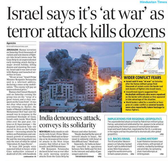 Diplomatic activities, too, have begun across the globe. Antony John Blinken, the US Secretary of State, has announced that Washington DC is fully on Israel’s side, saying that the Joe Biden Administration shall provide Tel Aviv with weapons, if necessary. He also announced that the US naval vessels left for Israel. As expected, Iran has stood by Palestine. Iranian President Ebrahim Raisi has talked to various leaders of Hamas and the Islamic Jihad Movement over the phone. They have reportedly discussed the progress of the conflict in detail. Ali Akbar Velayati, a senior Adviser (International Affairs) to the Supreme Leader Ayatollah Seyyed Ali Hosseini Khamenei, has described the Hamas’ terror attacks in Israel as a major strategic victory. The Hamas leaders have also contacted the top political leadership of the UAE on the second day of the conflict.