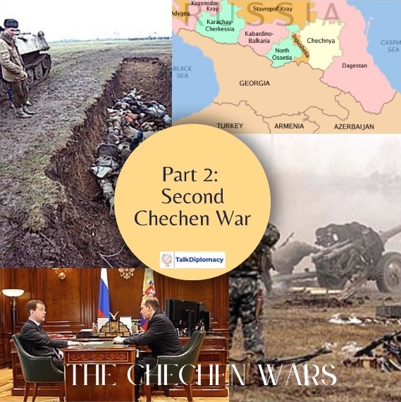 The Second Chechen War took place in Chechnya and the border regions of the North Caucasus between the Russian Federation and the Chechen Republic of Ichkeria from August 1999 to April 2009. The War began in 1999 when Russia, under President Vladimir Putin, launched a new military campaign in response to incursions by Chechen insurgents into the neighbouring Russian region of Dagestan and bombings in Moscow. This conflict saw a more ruthless and brutal approach from the Russian Forces, including heavy aerial and artillery bombardments. Grozny, the Chechen capital, was devastated. By 2009, Russia declared victory and ended its large-scale military operations, although sporadic violence and insurgency continued.