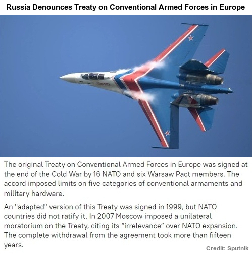 In a statement, the Russian Foreign Ministry blasted the US and its Western allies for the move, as well as the West’s allegedly “destructive position” on the treaty. The ministry stated: “We left the door open for a dialogue on ways to restore the viability of conventional arms control in Europe. However, our opponents did not take advantage of this opportunity.” Earlier, the Putin Administration hinted that it would no longer be a party to an arms control treaty signed during the Cold War.